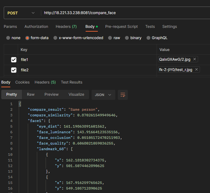 Test with an image file: Send a `POST` request to <http://{xx.xx.xx.xx}:8081/compare_face>\