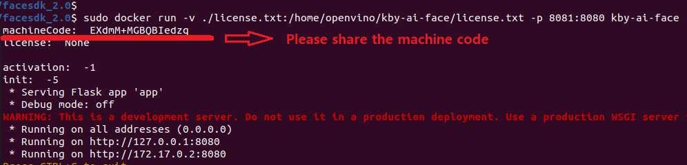 * Send us the `machine code` and replace the `license.txt` file you received. Then, run the `Docker` container again.